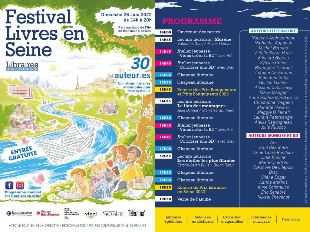 La librairie Au pays des livres est membre de l’association Libraires en Seine, qui fête les 10 ans de ses prix littéraires. A cette occasion, nous organisons une journée festive et littéraire en bords de Seine le 26 juin sur l’île de Monsieur à Sèvres, gratuite et ouverte à tous.
